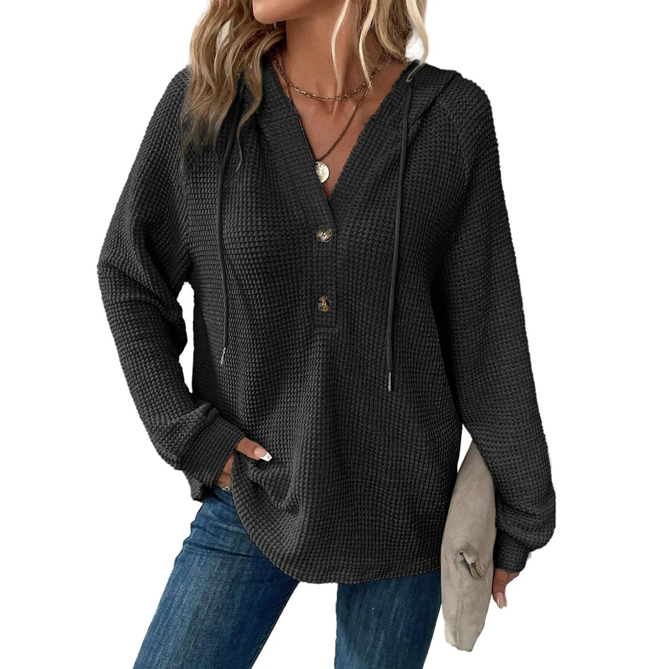 Women's hooded waffle knit button V-neck long sleeved sweater sweatshirt top-