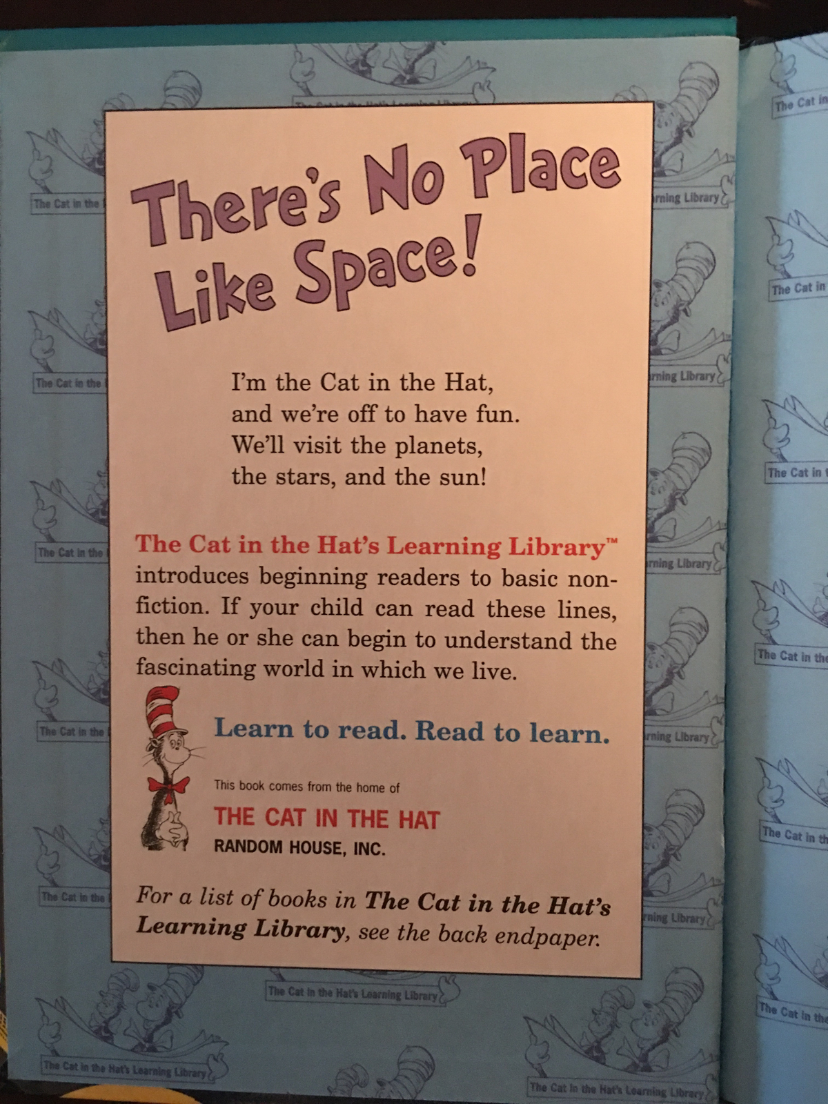 #1 WALL STREET JOURNAL BESTSELLER * Laugh and learn with fun facts about the sun, the moon, the planets, constellations, astronauts, and more--all told in Dr. Seuss's beloved rhyming style and starring The Cat in the Hat! "The universe is a mysterious place. We are only just learning what happens in space." The Cat in the Hat's Learning Library series combines beloved characters, engaging rhymes, and Seussian illustrations to introduce children to non-fiction topics from the real world! On this adventure into outer space, readers will discover: * what makes each planet in our solar system unique * how a million Earths could fit inside the sun * how astronauts have driven a special car all over the moon * and much more! Perfect for story time and for the youngest readers, There's No Place Like Space: All About Our Solar System also includes an index, glossary, and suggestions for further learning. Look for more books in the Cat in the Hat's Learning Library series! Cows Can Moo! Can You? All About Farms Hark! A Shark! All About Sharks If I Ran the Dog Show: All About Dogs Oh Say Can You Say Di-no-saur? All About Dinosaurs On Beyond Bugs! All About Insects One Vote Two Votes I Vote You Vote Who Hatches the Egg? All About Eggs Why Oh Why Are Deserts Dry? All About Deserts Wish for a Fish: All About Sea Creatures, Au revoir , Pluto In this beloved revised classic, beginning readers and budding astronomers are launched on a wild trip to visit the eight planets in our solar system (per the International Astronomical Union's 2006 decision to downgrade Pluto from a planet to a dwarf planet), along with the Cat in the Hat, Thing One, Thing Two, Dick, and Sally. It's a reading adventure that's out of this world, #1 WALL STREET JOURNAL BESTSELLER - Laugh and learn with fun facts about the sun, the moon, the planets, constellations, astronauts, and more--all told in Dr. Seuss's beloved rhyming style and starring The Cat in the Hat! "The universe is a mysterious place. We are only just learning what happens in space." The Cat in the Hat's Learning Library series combines beloved characters, engaging rhymes, and Seussian illustrations to introduce children to non-fiction topics from the real world! On this adventure into outer space, readers will discover: - what makes each planet in our solar system unique - how a million Earths could fit inside the sun - how astronauts have driven a special car all over the moon - and much more! Perfect for story time and for the youngest readers, There's No Place Like Space: All About Our Solar System also includes an index, glossary, and suggestions for further learning. Look for more books in the Cat in the Hat's Learning Library series! Cows Can Moo! Can You? All About Farms Hark! A Shark! All About Sharks If I Ran the Dog Show: All About Dogs Oh Say Can You Say Di-no-saur? All About Dinosaurs On Beyond Bugs! All About Insects One Vote Two Votes I Vote You Vote Who Hatches the Egg? All About Eggs Why Oh Why Are Deserts Dry? All About Deserts Wish for a Fish: All About Sea Creatures