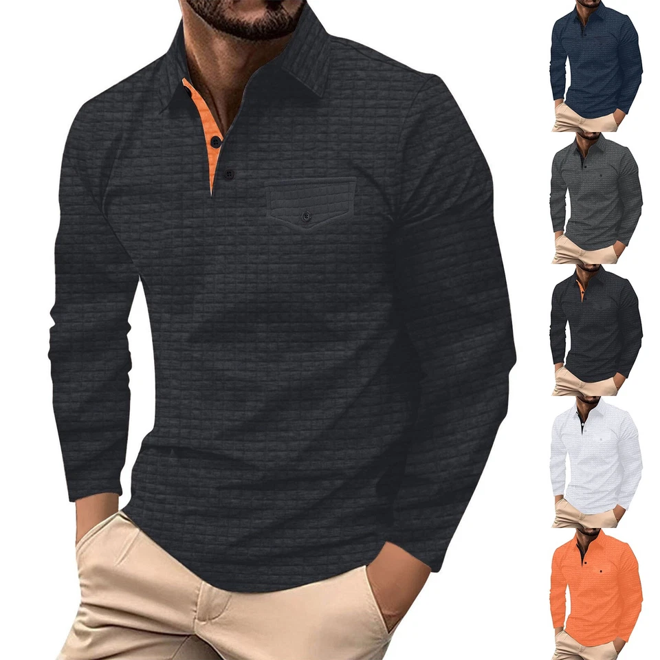 Herren Poloshirt Freizeit Langarm Hemd Oberteil Knopfleiste Golfhemd mit Tasche--