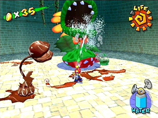 Nintendo's flagship character returns for more platform action in his first starring role in a 3D game since 1996's genre defining Super Mario 64. Upon his arrival to Isle Delfino for some well-deserved rest and relaxation, Mario finds himself under scrutiny from the local inhabitants. Apparently someone dressed like Mario has been polluting the island with an ooze-like substance, so the town sentences the Italian plumber to clean the mess up. Mario must not only clear the town but also clear his sullied reputation by finding the mischievous fellow responsible for the deed. To combat this new environmental threat, Mario comes equipped with a water cannon mounted on his back. A meter in the bottom right corner of the screen depicts the amount of water left in his backpack as he sprays the ooze to wash it away. By removing the graffiti and grime from the town, Mario will reveal additional areas to explore. Each new region is accessed from a portal within Delfino Town in a manner similar to the paintings in Super Mario 64's castle. To activate a portal, Mario must collect a certain number of shines, golden suns that function like the stars in Super Mario 64. Shines are earned by solving puzzles, defeating boss characters, or by simply finding them within a level. As in previous adventures, Mario can collect 100 yellow coins in each level and will encounter familiar creatures such as Piranha Plants and Bullet Bills while advancing through the seaside environments. Basic moves include the repertoire introduced in Super Mario 64 as well as the added functions of the water cannon. Mario can use it to blast into the sky and fly for short periods of time before the water needs to be replenished. Dinosaur pal Yoshi can also be ridden and used to solve puzzles or to attack enemies. Other collectibles include both red and blue coins, ten of which are hidden on a level. Only by finding enough shines can Mario help save the world from the murkiness created by his dastardly double.