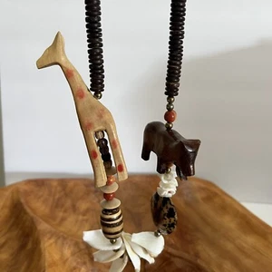 Vintage geschnitztes Holz & Muschel Safari afrikanische Perlenkette klobig Giraffe Nilpferd-
