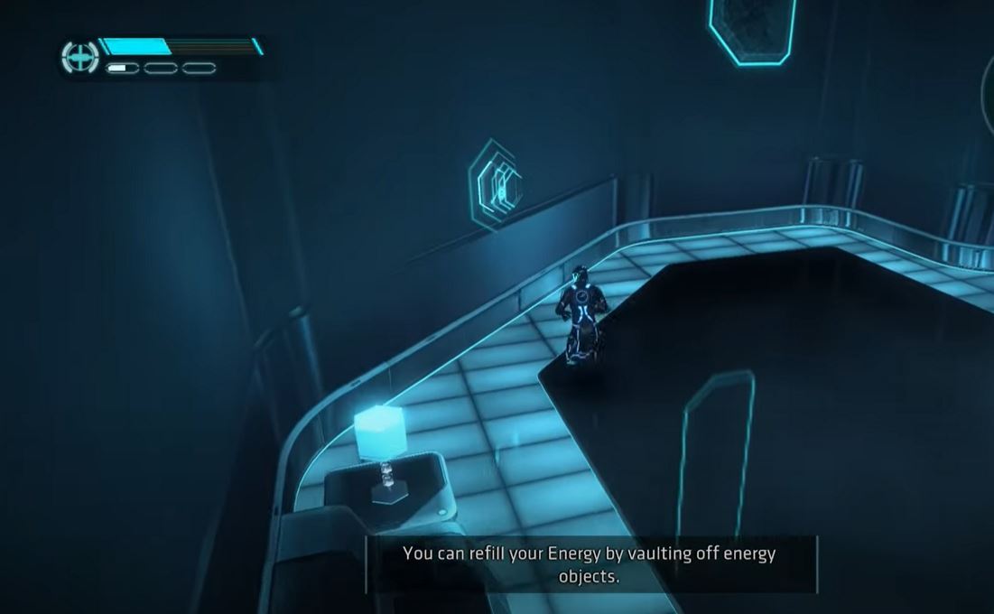 Created and released in conjunction with Disney's feature-film sequel, Tron: Evolution is an action-driven adventure that plays through story events taking place between 1982's original Tron and 2010's Tron Legacy. The various console and handheld versions of the title are set at different places in the timeline, with the Xbox 360 game focusing on the ten years between 1990 and 2000. The main hero is a monitor program, created by Flynn. Like other characters, the hero appears as a human in the neon-gridded cyber-realm in which the movies and games are set. In third-person perspective control of this personified program, players face parkour-influenced platforming challenges and regular assaults by computer-controlled enemies, as they endeavor through levels that reveal key moments in the Tron narrative. The Tron disc is used in combat, hurled for ranged attacks and wielded like a circular blade in melee. Battles involve agile dodges, vaulting leaps, and diving strikes. Superhuman acrobatics move players through some of the game's most vertigo-inducing areas, as well, with leaps, flips, and gravity-defying wall-runs through Escher-esque corridors. In other sequences, players pilot light cycles, leaving behind labyrinths of impenetrable energy walls as they race ahead. As the hero progresses through the adventure, players earn upgrades that can be used to enhance disc or light cycle abilities. Player-characters can also gain upgrades in the game's online multiplayer modes, which feature team-based styles of disc and light-cycle combat.