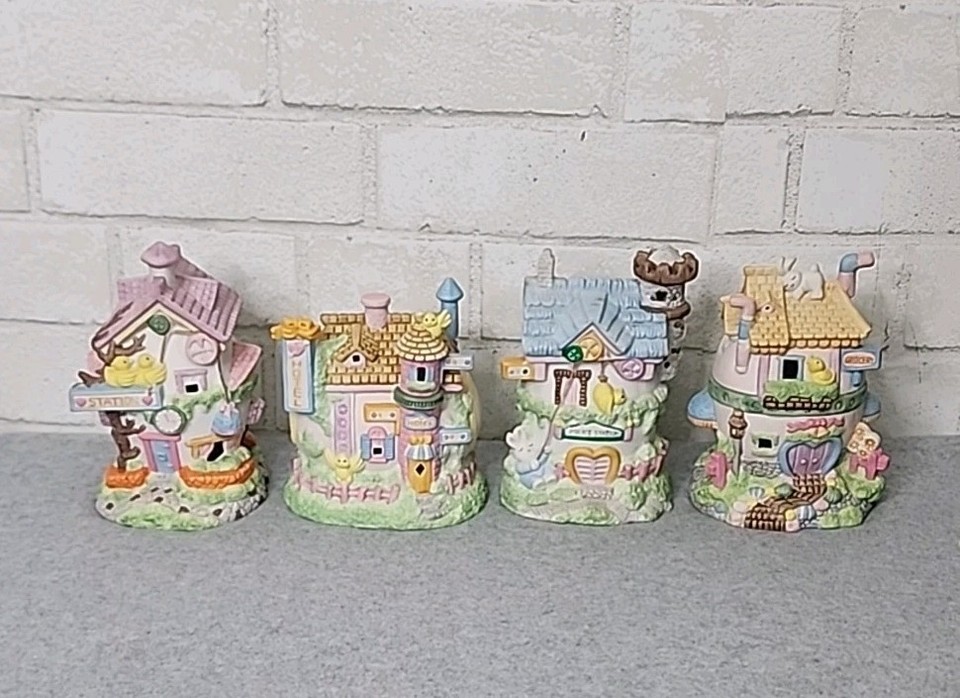 Osterdorf Porzellan Gebäude Lebensmittelgeschäft Hotel Station Polizeistation 4-teiliges Set-