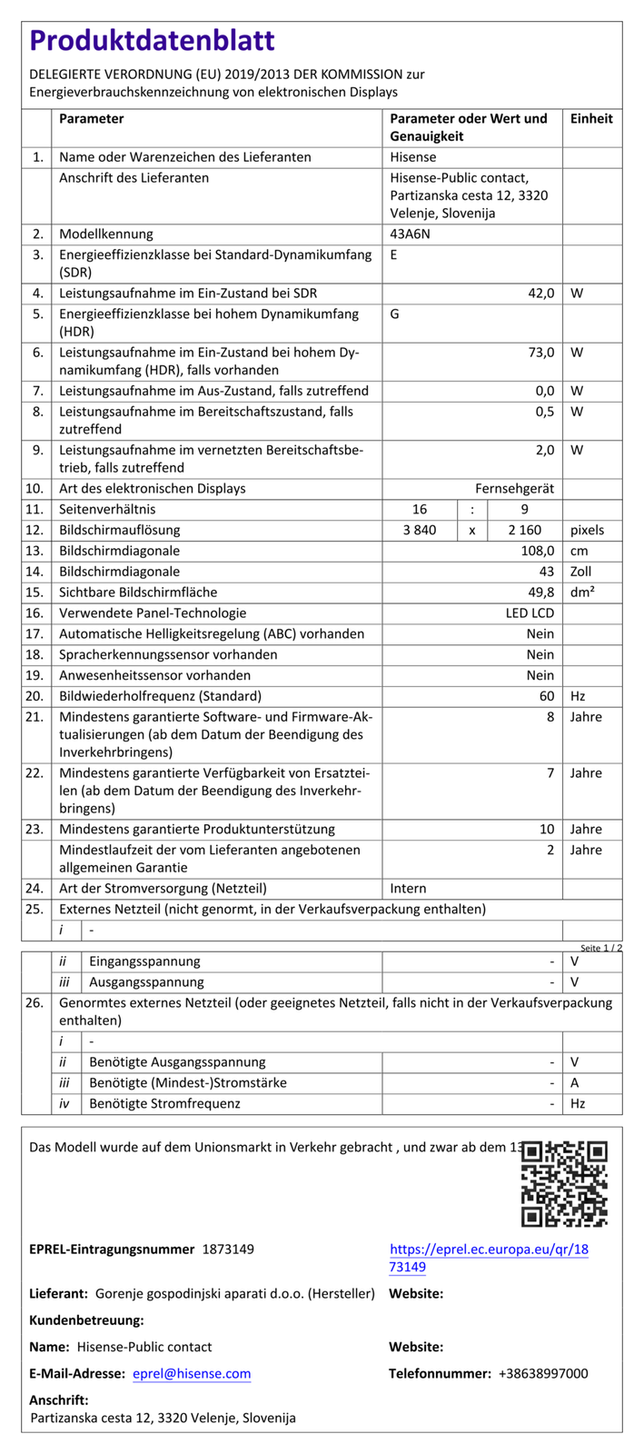 HISENSE Fernseher 43A6N 43 Zoll 4K Ultra HD LED TV #32103156
