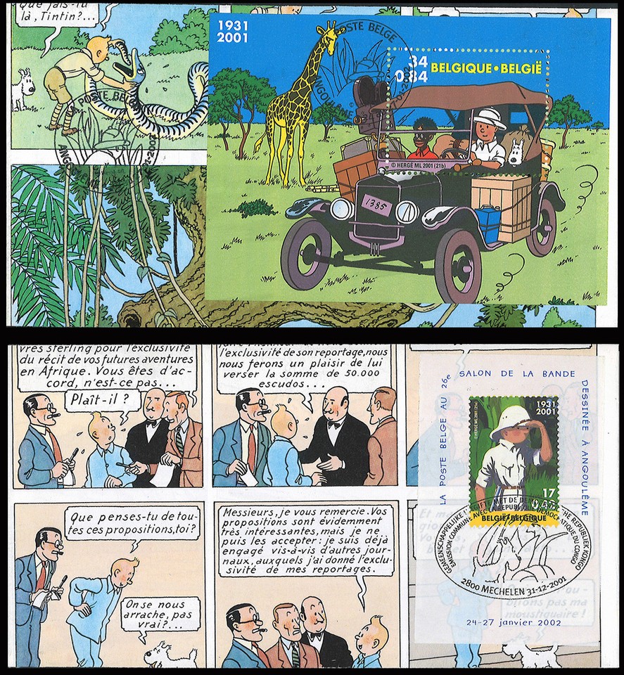 TIN01-CO11/35 2 FDC Sammler BELGIEN 2001 Block + tp "TIM UND STRUPPI IM KONGO" 2 gestempelt.-