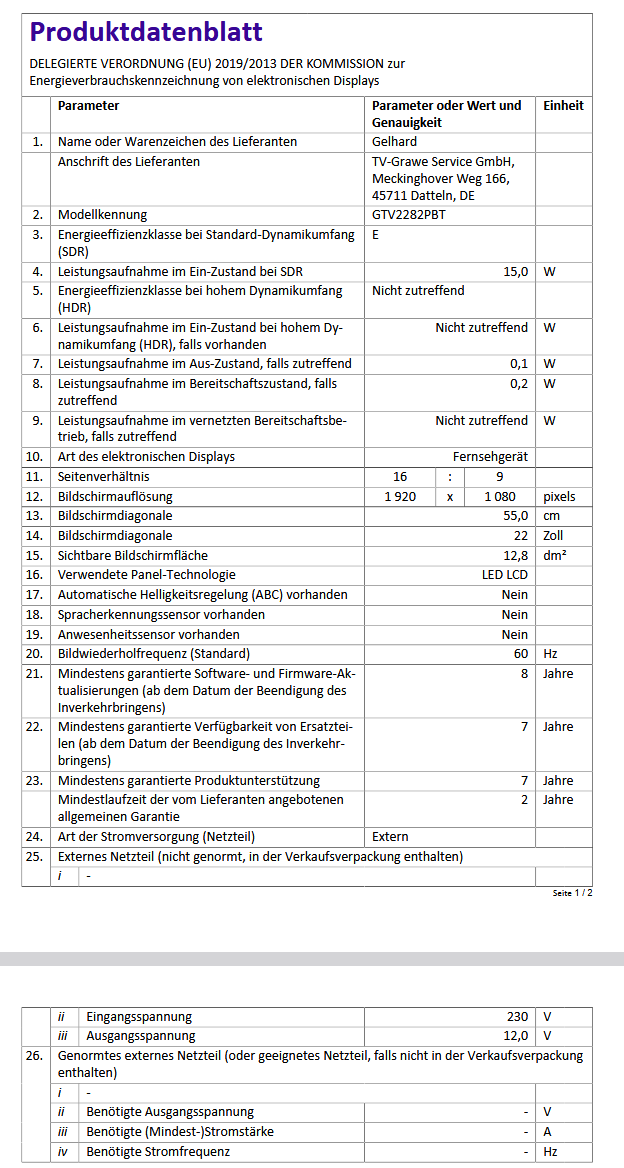 Gelhard GTV2282PBT LED 22 Zoll Wide Screen TV DVD DVB/S/S2/T2/C 12/24/230 Volt