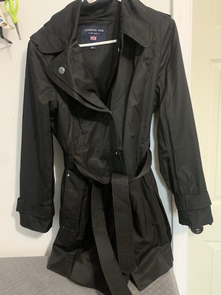 London Fog Damen Trenchcoat schwarz - Gr. Large L Gürtel Kapuze Mantel Knopf-
