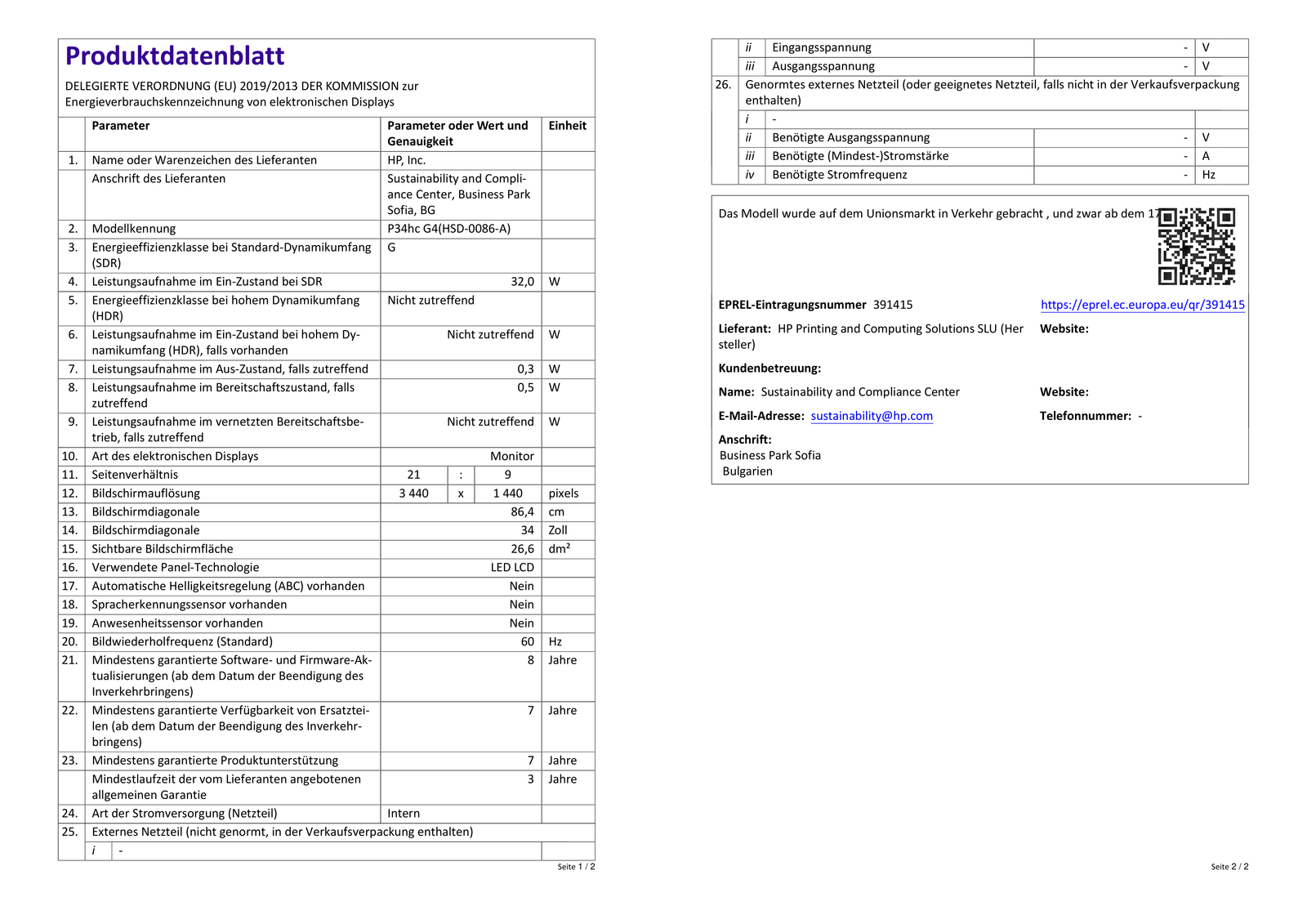 HP - B2B P34hc G4 34 Zoll QHD Business Monitor (5 ms Reaktionszeit