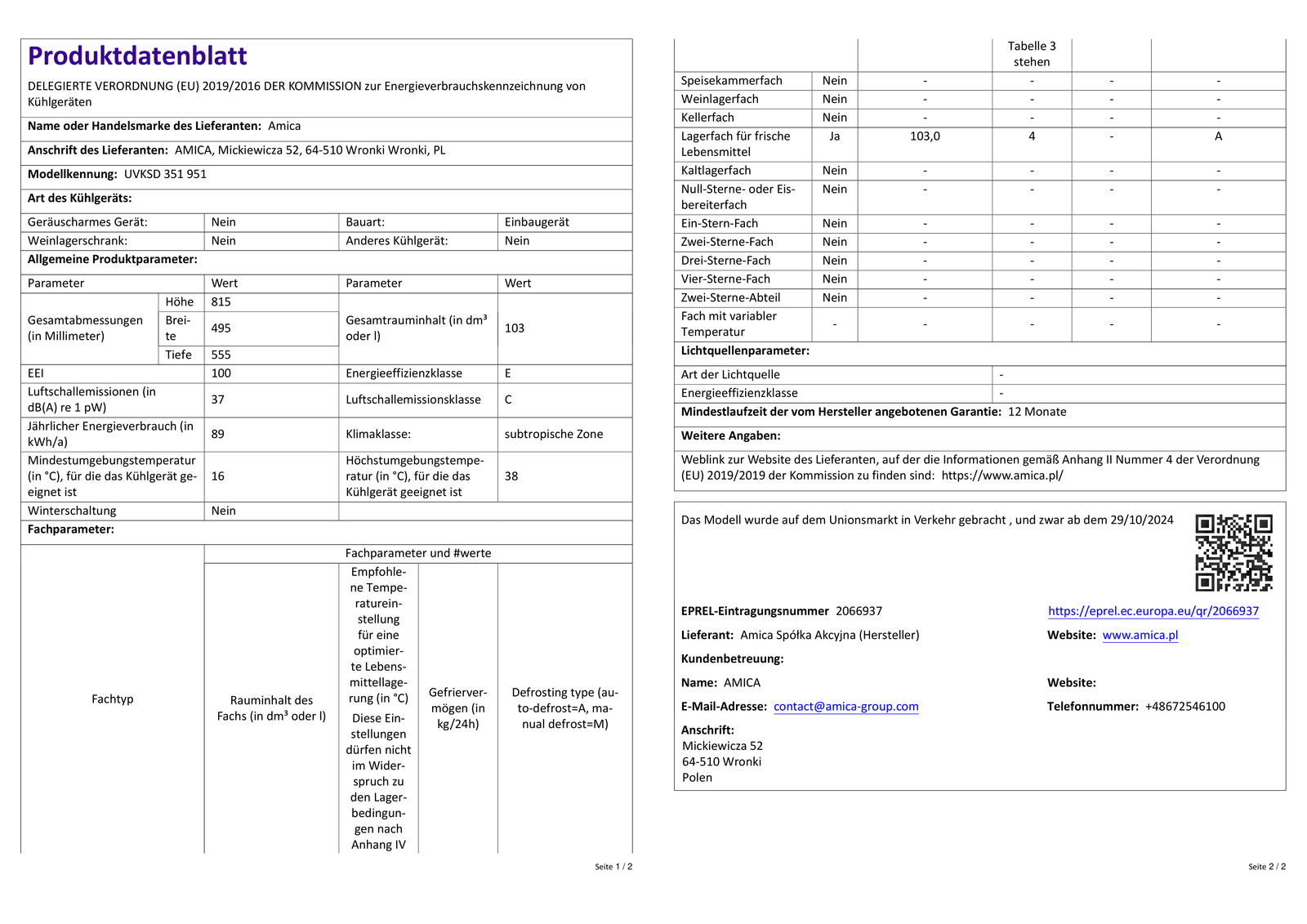 AMICA UVKSD 351 951 Unterbau-Vollraumkühlschrank (103 l, E, 815 mm hoch, Weiß)