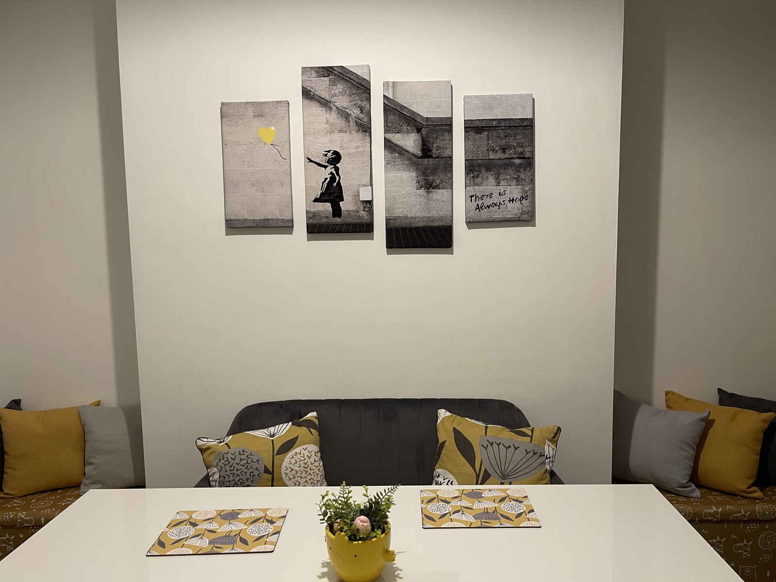 LR Banksy Kunstdruck gelb grau Ballon Mädchen geteilte Wand Leinwand Bild gerahmt 1-