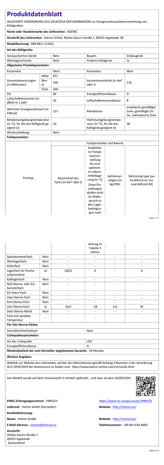 KOENIC KBK 8811 D DOD Kühlschrank (116 l, D, 871 mm hoch}, weiß)