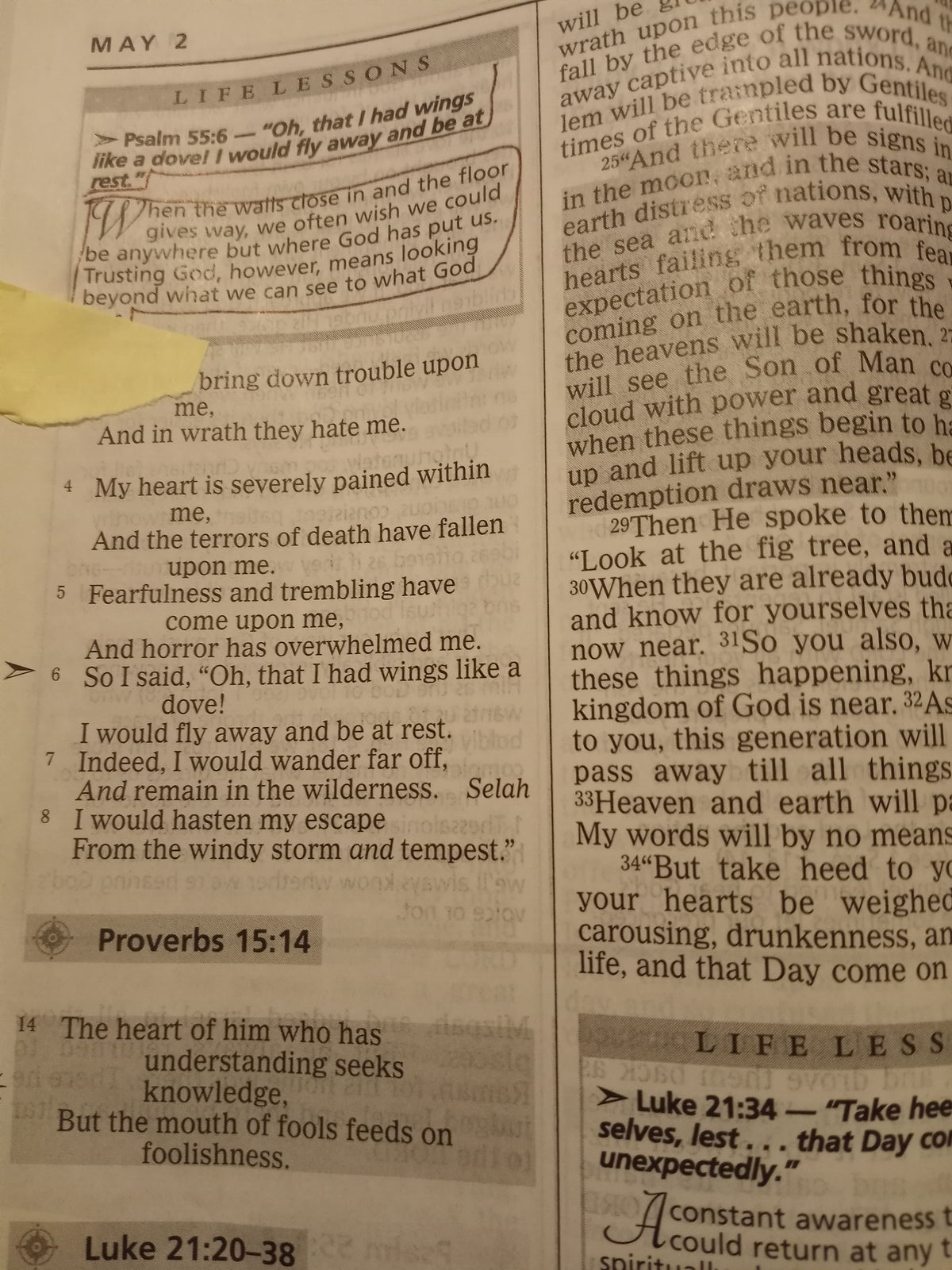 The text of this New King James Version Bible is arranged in 365 portions, including devotional insights derived from Dr. Stanley's Life Principles Bible. The full text of the Bible is broken into daily readings so you can read the Bible in a year., Grow in knowledge and understanding of God through His Word. The text of this New King James Version® (NKJV) Bible is arranged in 365 portions, each including devotional insights derived from Dr. Stanley's Life Principles Bible. The full text of the Bible is broken into daily readings so you can read the Bible in a year. The daily 15-minute readings consist of a passage from the Old Testament, readings from Psalms and Proverbs, and a New Testament passage. Notes from Dr. Stanley shed additional light on each day's readings, and articles apply the Scriptures to our daily lives. This daily Bible is designed to bring more focus and depth to the time spent in God's Word. Features include: NKJV text for daily reading Life Principles articles focusing on daily application Life Examples from the people of the Bible Answers to Life's Questions and What the Bible Says About articles Life Lessons that give insight into Scripture portions 9.5-point type size Part of the Signature Series line of Thomas Nelson Bibles. Charles F. Stanley Life Principles Daily Bibles sold to date: More than 114,000 The New King James Version--More than 60 million copies sold in 30 years, Discover and apply practical, life-changing principles as you read the Word daily. Grow in knowledge and understanding of God through His Word. The text of this New King James Version® (NKJV) Bible is arranged in 365 portions, each including devotional insights derived from Dr. Stanley's Life Principles Bible. The full text of the Bible is broken into daily readings so you can read the Bible in a year. The daily 15-minute readings consist of a passage from the Old Testament, readings from Psalms and Proverbs, and a New Testament passage. Notes from Dr. Stanley shed additional light on each day's readings, and articles apply the Scriptures to our daily lives. This daily Bible is designed to bring more focus and depth to the time spent in God's Word. Helping readers discover and apply biblical principles daily, The Charles F. Stanley Life Principles Daily Bible has been recognized with the ECPA Bronze Award for selling over 400,000 copies across translations. Features include: Complete Bible text divided into daily reading portions Life Principles articles highlight Dr. Stanley's essentials for Christian living Life Lessons that give insight into Scripture portions Life Examples articles touch on key Bible Characters Answers to Life's Questions articles show how the Bible applies to the challenges we face in our Christian walk What the Bible Says About articles highlight Scriptures that deal with topics of special interest to believers Travel size edition with a one-inch-thick spine to take with you anywhere you go Easy-to-Read 9.5-point print size The New King James Version--More than 60 million copies sold in 30 years, Grow in knowledge and understanding of God through His Word. The text of this New King James Version(R) (NKJV) Bible is arranged in 365 portions, each including devotional insights derived from Dr. Stanley's Life Principles Bible. The full text of the Bible is broken into daily readings so you can read the Bible in a year. The daily 15-minute readings consist of a passage from the Old Testament, readings from Psalms and Proverbs, and a New Testament passage. Notes from Dr. Stanley shed additional light on each day's readings, and articles apply the Scriptures to our daily lives. This daily Bible is designed to bring more focus and depth to the time spent in God's Word. Features include: NKJV text for daily reading Life Principles articles focusing on daily application Life Examples from the people of the Bible Answers to Life's Questions and What the Bible Says About articles Life Lessons that give insight into Scripture portions 9.5-point type size Part of the Signature Series line of Thomas Nelson Bibles. Charles F. Stanley Life Principles Daily Bibles sold to date: More than 114,000 The New King James Version--More than 60 million copies sold in 30 years, Discover and apply practical, life-changing principles as you read the Word daily. Grow in knowledge and understanding of God through His Word. The text of this New King James Version(R) (NKJV) Bible is arranged in 365 portions, each including devotional insights derived from Dr. Stanley's Life Principles Bible. The full text of the Bible is broken into daily readings so you can read the Bible in a year. The daily 15-minute readings consist of a passage from the Old Testament, readings from Psalms and Proverbs, and a New Testament passage. Notes from Dr. Stanley shed additional light on each day's readings, and articles apply the Scriptures to our daily lives. This daily Bible is designed to bring more focus and depth to the time spent in God's Word. Helping readers discover and apply biblical principles daily, The Charles F. Stanley Life Principles Daily Bible has been recognized with the ECPA Bronze Award for selling over 400,000 copies across translations. Features include: Complete Bible text divided into daily reading portions Life Principles articles highlight Dr. Stanley's essentials for Christian living Life Lessons that give insight into Scripture portions Life Examples articles touch on key Bible Characters Answers to Life's Questions articles show how the Bible applies to the challenges we face in our Christian walk What the Bible Says About articles highlight Scriptures that deal with topics of special interest to believers Travel size edition with a one-inch-thick spine to take with you anywhere you go Easy-to-Read 9.5-point print size The New King James Version--More than 60 million copies sold in 30 years