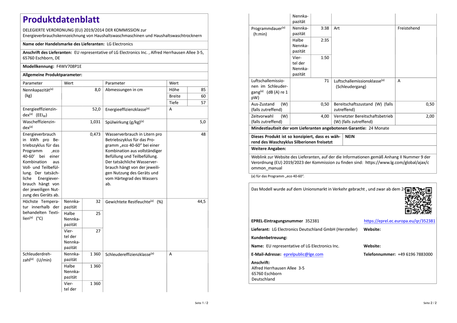 LG F4WV708P1E Waschmaschine (8 kg, 1360 U/Min., A)