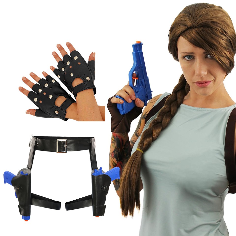 TOMB RAIDER LARA CROFT KOSTÜM PERÜCKE WAFFEN HOLSTER HANDSCHUHE HALLOWEEN-