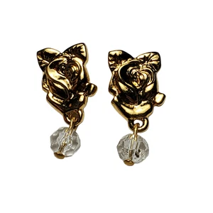 VTG 80s LCi Rose Drop Dangle Earrings Gold-Tone Rhinestone Floral