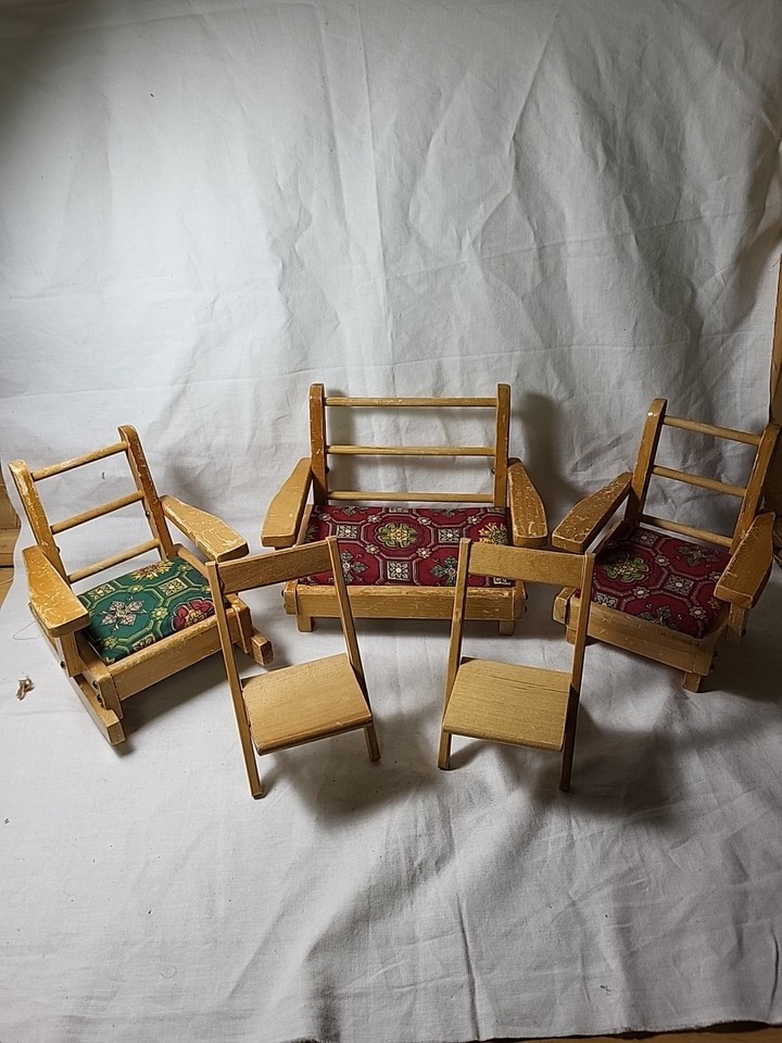 Vintage Pert Pat Wood Doll Furniture Couch, Rocking Chair, Chair & Folding Chair