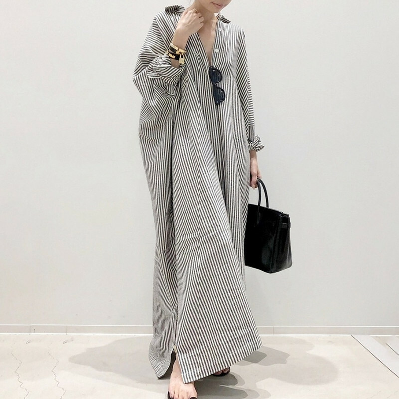 Japanische Damen locker große Größen Langarm gestreift Baumwolle Leinen Kleid Shirt Ski-