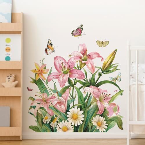 2 Sheets Removable Romantic Flowers Wall Decal Lily Daisy Floral Wall Pink