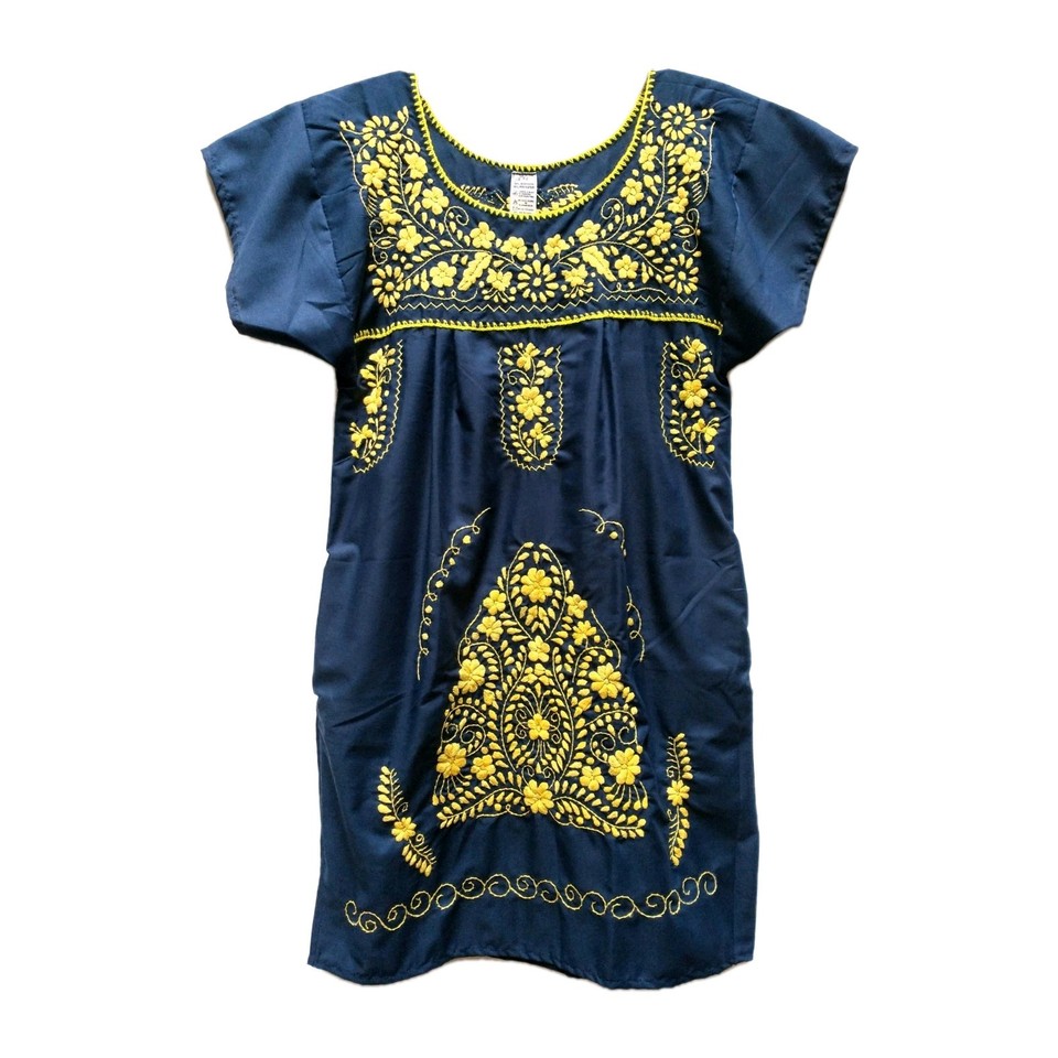 Mexikanisches marineblau & gelb Blumen Handstickerei Kleid Puebla Tunika mit Taschen S-