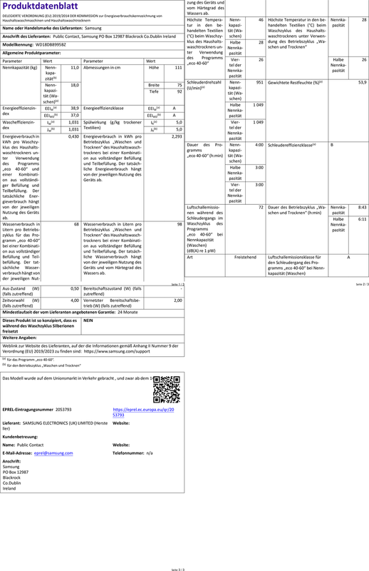 Artikel 2 SAMSUNG WD18DB8995BZT2 Waschtrockner (18 kg / 11 kg, 951 U/Min.)