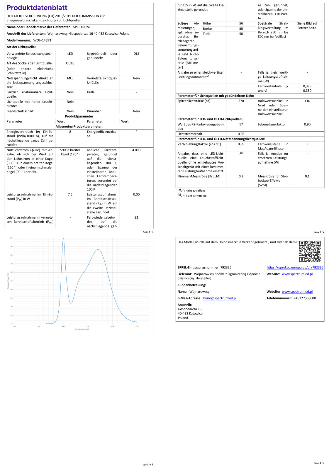 Artikel 4 LED GU10 230V 7,5W SMD NW z MLECZNĄ SZYBKĄ biała plastikowa SPECTRUM