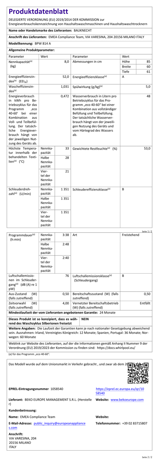 BAUKNECHT BPW 814 A Waschmaschine (Frontlader, freistehend, 8 kg, 1.400 U/Min). Anti-Allergie - reduziert die häufigsten Allergene wie Pollen, Milben oder Tierhaare. Option Extra Touch – verkürzt wahlweise die Zyklusdauer oder intensiviert die Waschleistung.