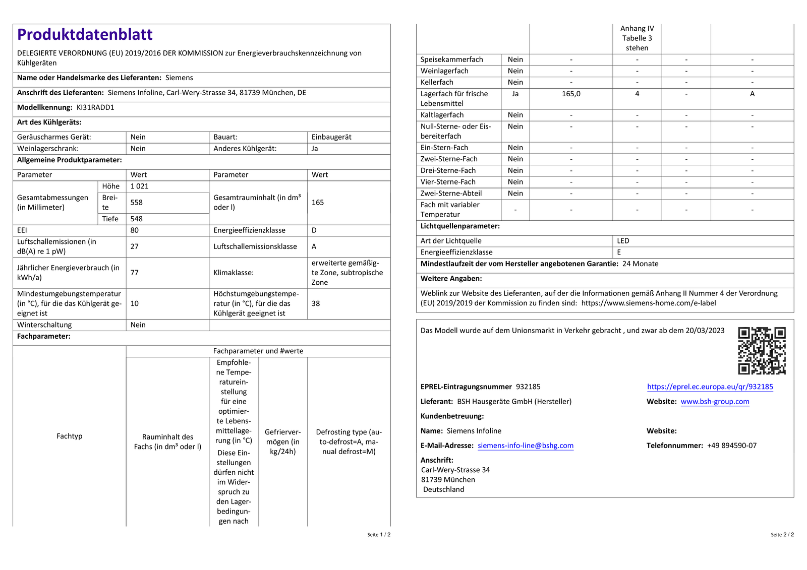 Artikel 2 Siemens KI31RADD1 iQ500 Einbaukühlschrank, Nischenhöhe 102,5 cm, 165 L, Flachsch