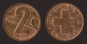 SCHWEIZ HELVETIA 2 RAPPEN 1954 B Q.FDC/aUNC FAST PRÄGEBLÜTE