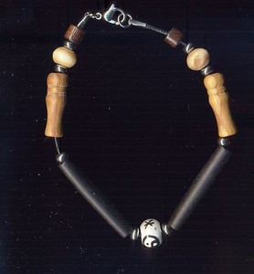 Stahlarmband mit Perlen aus Jaspis, Holz, Knochen und Charms