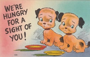 Vintage Postkarte Humor Comic Traurige Welpen, Hungrig nach einem Anblick von dir!