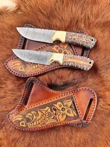 Custom Handmade Damascus Steel two Knives and Sheath Cowboy Skinner.