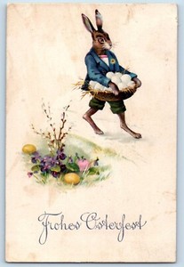 Oster Postkarte anthropomorpher Hase mit Eiern Blumen Pfeife Beere um 1910