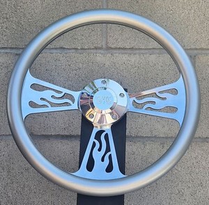 14" Billet Flame Steering Wheel with Silver Vinyl Wrap and SS Horn Button