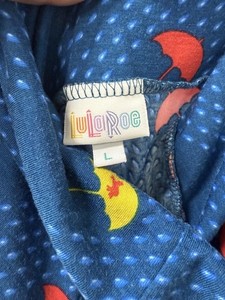 Lularoe L Maxirock blau rot Regenschirm verstecktes Einhorn Regentropfen Baumwolle Vintage