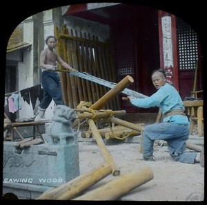 CHINESISCHE MÄNNER SÄGEN HOLZ PORZELLAN UM 1920 ANTIK Magische Laterne Dia FOTO SHANGHAI ?