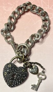 Vintage Betsey Johnson Crystal Heart Padlock & Key Silvertone Brass Bracelet