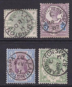 GB QV Surface Printed 1883 9d, 1887 5d die 1 etc. Leamington Spa CDS Cat 728€.