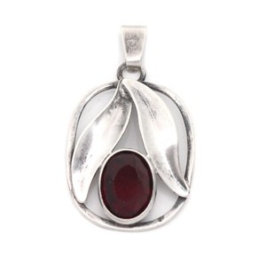 Art Deco Anhänger Silber - Roter Glasstein Rubinfarben - Floral Blume Handarbeit