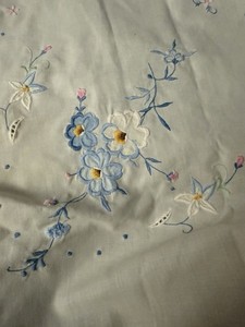 Vintage bestickte Tischdecke gewellte Kanten blau rosa & weiß Blumen 68"x48"