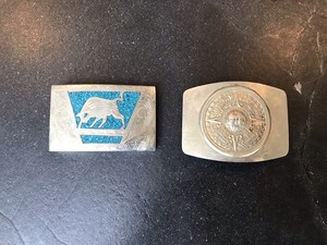 2 Vintage Alpaka Mexikanische Gürtelschnallen Stier und Azteken Maya Kalender