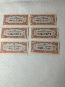 6 japanische Kriegsausgabe 1 Cent nicht im Umlauf befindliche Banknoten. 1 Menge 6 Banknoten. EUR 7,49