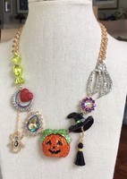 This necklace is very clever and fun to wear. Great colors. The pieces that dangle on the main chain are well balanced and extremely well made. Great clasp; easy to put on and remove yet made to be secure. One of the nicer Halloween jewelry items.